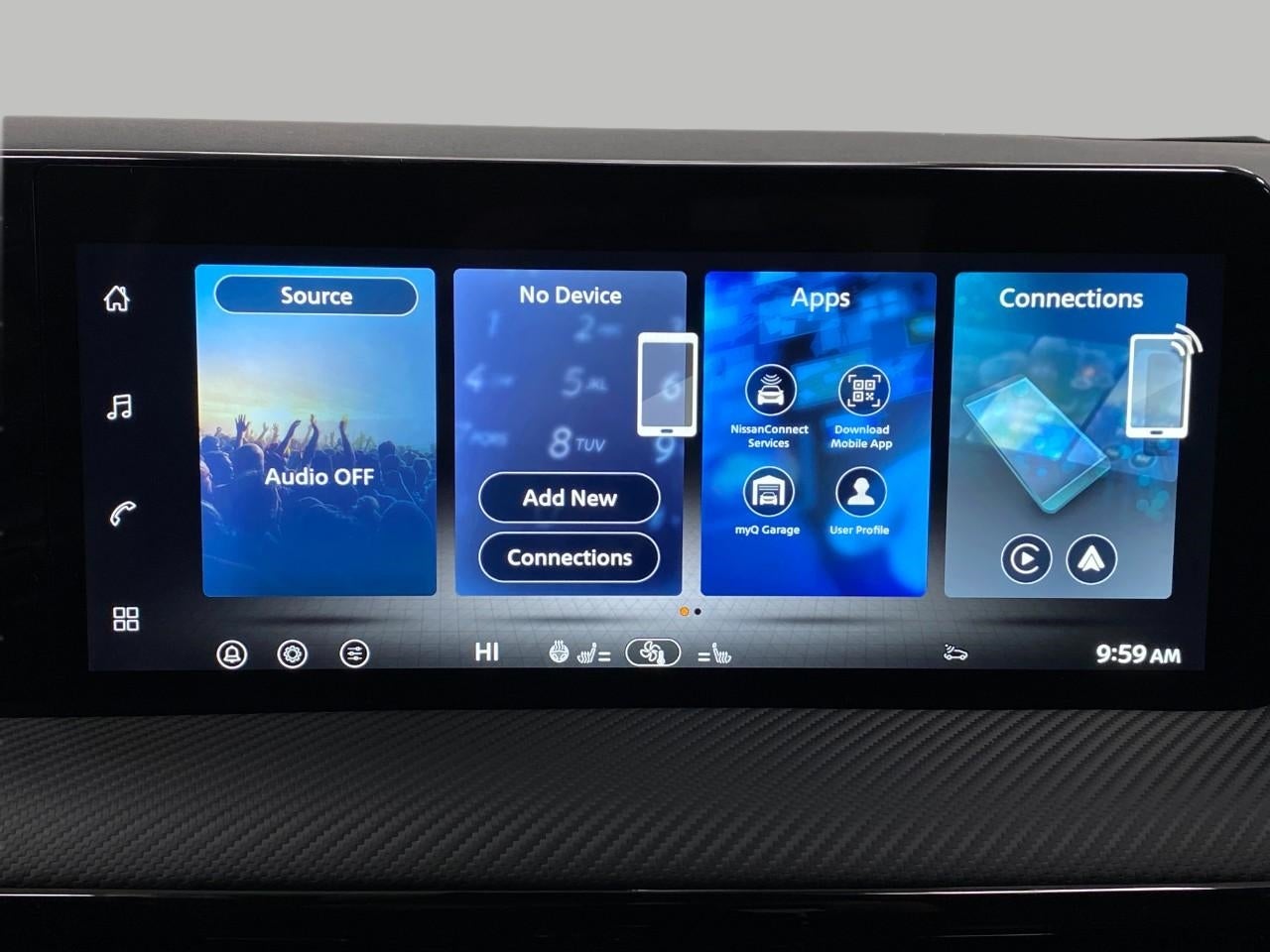 - Radio: AM/FM/SiriusXM Audio System -inc: 12.3" color touchscreen display w/6 speakers, Bluetooth® hands-free phone system, streaming audio via Bluetooth®, NissanConnect Services powered by SiriusXM featuring wireless Apple CarPlay, wireless Android Auto, Siri eyes free and hands-free text messaging assistant, audio and Bluetooth® steering wheel switches and Wi-Fi hotspot