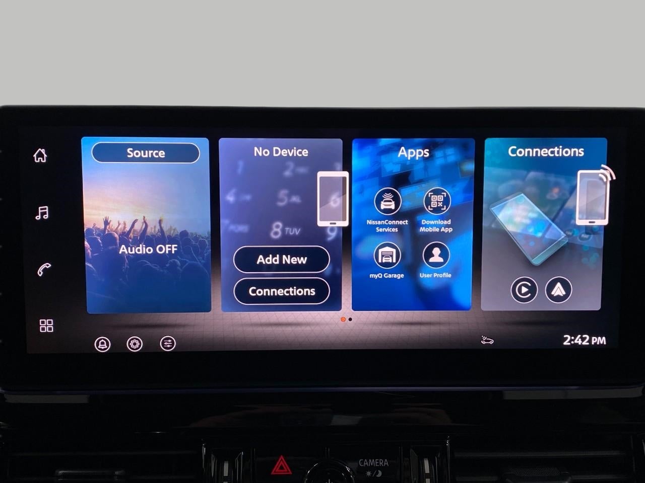 - Radio: AM/FM Audio System w/NissanConnect -inc: 6 speakers, 5G Wi-Fi hotspot, wireless Apple CarPlay and Android Auto, 12.3" multi-function information display, SiriusXM satellite radio, 2 front USB connection (1 type C charge and data ports), Bluetooth® hands-free phone system, streaming audio and messaging and hands-free text messaging assistant