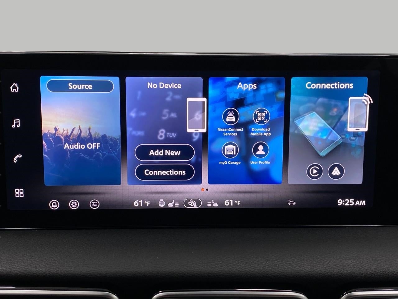 - Radio: AM/FM w/RDS/MP3 -inc: 6 speakers, 12.3" NissanConnect multimedia center display, Bluetooth® hands-free phone system, streaming audio via Bluetooth®, hands-free text messaging assistant, Siri Eyes Free, Google Assistant voice recognition, wireless Apple CarPlay and Android Auto, NissanConnect services, Wi-Fi hotspot, Over-The-Air (OTA) updating for headunit firmware via Wi-Fi WPA2 connection and (2) front USB connection port (type C)